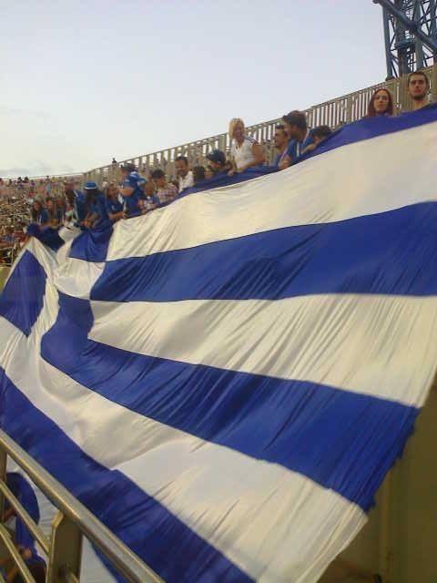 Ένα αγώνισμα πριν το τέλος και ήδη η ελληνική ομάδα βρίσκεται στη Σούπερ Λίγκα. Και μία τεράστια ελληνική σημαία ξεδιπλώνεται στο στάδιο.