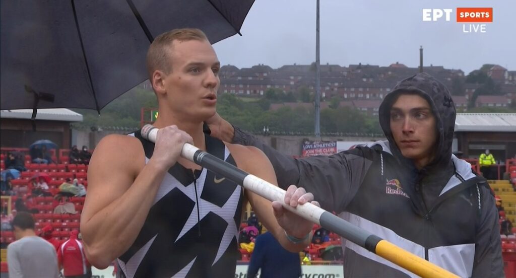 Στο επί κοντώ, o Kendricks πέρασε τα 5,74μ. με τη δεύτερη, ενώ ο Duplantis άφησε μια προσπάθεια που έχασε για λίγο στα 5,80μ. Χαρακτηριστικές ήταν οι σκηνές πριν τα άλματα που ο Duplantis κρατούσε ομπρέλα στον Kendricks.