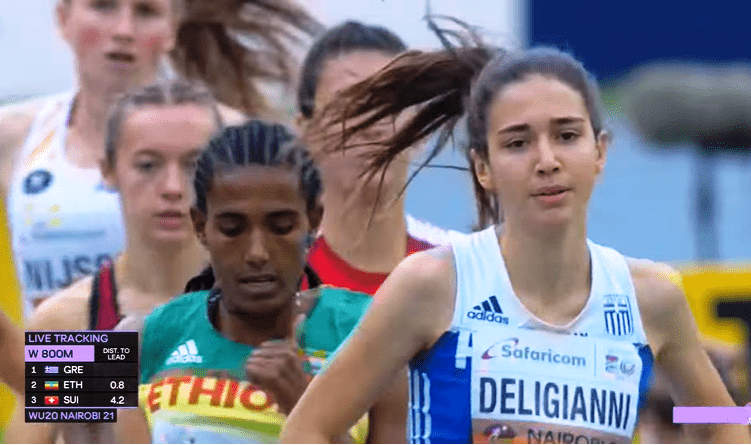 Σε ένα αγώνισμα που έπρεπε πριν να περάσει από προκριματικό και ημιτελικό, στην 3η της κούρσα στο Nairobi η Έλλη Δελληγιάννη έδωσε στον τελικό το ρυθμό που ήθελε κι οδήγησε όπως συνηθίζει την κούρσα, με πέρασμα στα 61″ με την Dagnachew από την Αιθιοπία πίσω της.