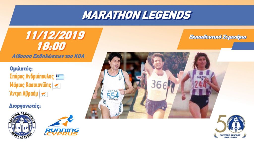 Σεμινάριο με θέμα ‘Marathon Legends’ θα διοργανωθεί την Τετάρτη 11 Δεκεμβρίου 2019 από τις 6:00 μέχρι 7:30 το απόγευμα στην αίθουσα εκδηλώσεων του ΚΟΑ, από κοινού από την Ακαδημία Αθλητισμού ΚΟΑ και τον αθλητικό οργανισμό ‘Running in Cyprus’.